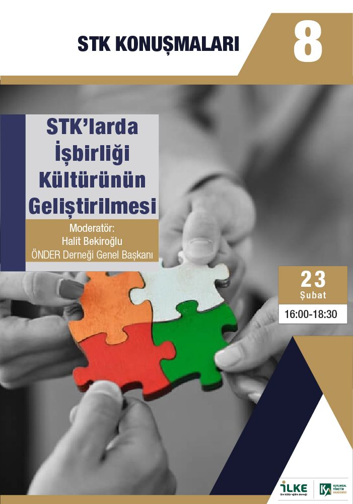STK Konuşmaları, sivil toplum kuruluşlarının önemli ve öncelikli meselelerinin katılımcı bir şekilde müzakere edildiği etkinlik serisidir.    STK Konuşmalarının birincisi "STK'larda İşbirliği İmkanlarının Geliştirilmesi" konusunda olacak.  Etkinlikte STK'lar arası işbirliğinin: Etkinlik, Önder Genel Başkanı Halit Bekiroğlu moderatörlüğünde 23 Şubat 2019 tarihinde 16:00-18:30 arasında  İLKE Derneği Teras Salonda gerçekleştirilecektir.  STK Konuşmaları, sivil toplum kuruluşlarının önemli ve öncelikli meselelerinin katılımcı bir şekilde müzakere edildiği etkinlik serisidir.  STK Konuşmalarının birincisi "STK'larda İşbirliği İmkanlarının Geliştirilmesi" konusunda olacak.  Etkinlikte STK'lar arası işbirliğinin: Mevcut durumu Önemi ve f Sürdürülebilir olması için gereklilikleri ele alınacak. Etkinlik, Önder Genel Başkanı Halit Bekiroğlu moderatörlüğünde 23 Şubat 2019 tarihinde 16:00-18:30 arasında  İLKE Derneği Teras Salonda gerçekleştirilecektir.  Etkinlik, Önder Genel Başkanı Halit Bekiroğlu moderatörlüğünde  23 Şubat 2019 tarihinde 16:00-18:30 arasında  İLKE Derneği Teras Salonda gerçekleştirilecektir.