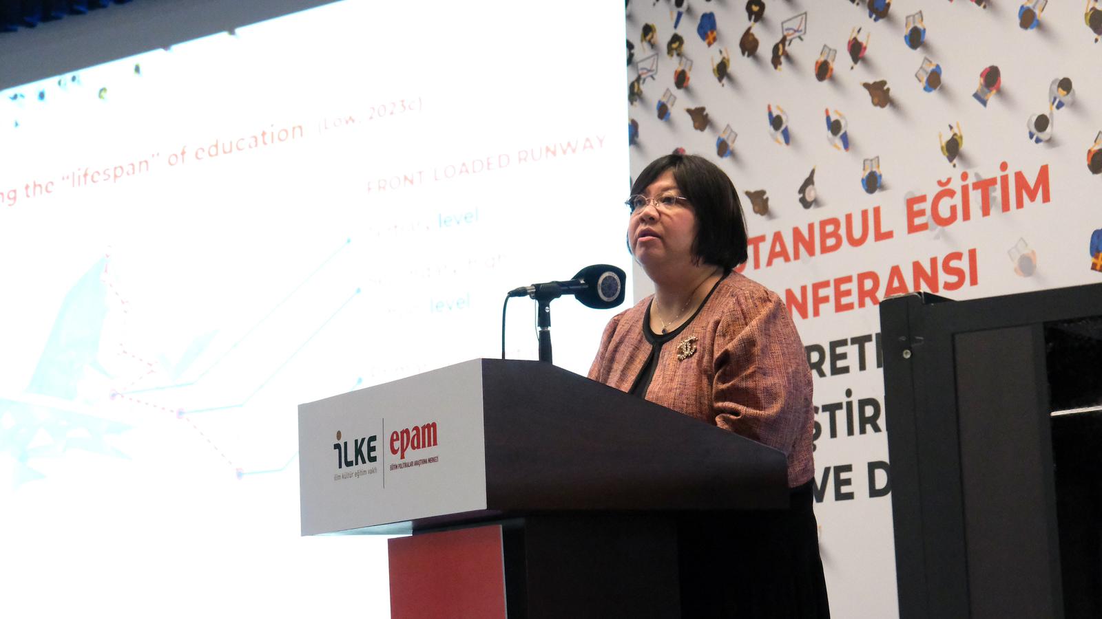 Bir diğer konuşmacı Prof. Dr. Low Ee Ling, “Krizler Çağında Öğretmen Eğitimi Paradigma ve Yaklaşımlarını Yeniden Düşünmek” başlıklı sunumunda, 21. yüzyılda öğretmenliğin değişen rolünü ele aldı. Öğretmenliğin dört temel dayanağı olarak dirençlilik, değerlere bağlılık, kanıta dayalılık ve yaşam boyu mesleki gelişimi vurguladı. Yapay zekâ, çevresel krizler ve sosyo-duygusal ihtiyaçların öğretmenlerin görevini daha karmaşık hâle getirdiğini belirtti. Singapur modeli üzerinden öğretmen gelişiminin sürekliliğine dikkat çekerken, geleceğe hazır öğretmenlerin disiplinlerarası düşünebilen ve ahlaki değerlere sahip bireyler olması gerektiğini ifade etti.