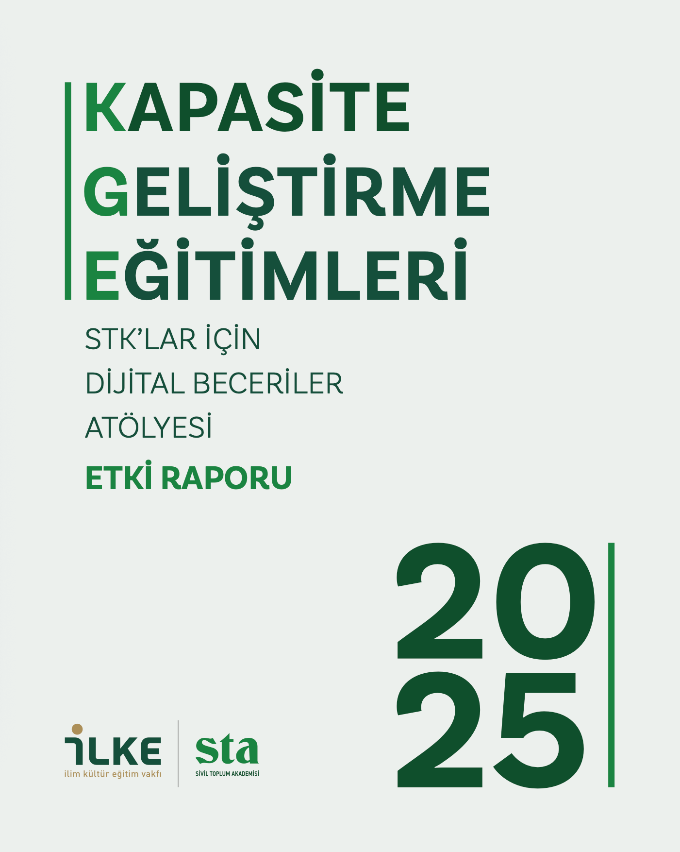 “Kapasite Geliştirme Eğitimleri” (KGE) çatısı altında yürütülen Dijital Beceriler Atölyesi programı kapsamında hazırlanan etki raporu, eğitimin katılımcılar üzerindeki kazanımlarını bilgi, beceri ve tutum değişikliği boyutlarıyla inceleyerek, programın kurumsal kapasiteye sunduğu katma değeri somut verilerle ortaya koymaktadır. Sivil Toplum Akademisi bünyesinde eğitim verimliliğinin ölçümlendiği bu ilk çalışmada; stratejik planlamadan yapay zeka farkındalığına uzanan geniş bir perspektifte, sivil toplumun dijital dönüşüm dinamikleri ve gelişim süreçleri kayıt altına alınmıştır.Bu Raporda Neler Bulacaksınız?Dijital Yetkinlik ve Beceri Analizi: Katılımcıların eğitim öncesi ve sonrası yetkinlik düzeylerini karşılaştıran; bilgi, beceri ve tutum eksenindeki somut gelişim süreçlerini merkeze alan değerlendirmeler.Stratejik Performans ve Operasyonel Verimlilik: Dijital strateji geliştirme ve kampanya yönetimi süreçlerinde gözlemlenen niteliksel artışın, kurumsal verimliliğe ve uygulama kapasitesine sağladığı katma değerin analizi.Dijital Araç Seti ve Teknik Adaptasyon: Sivil toplum çalışmalarında kullanılan dijital araçların kullanım derinliğine dair bulgular ile bu araçların kurumsal iş süreçlerine entegrasyon düzeyindeki gelişim verileri.Kurumsal Kapasite ve Sektörel Yansımalar: Katılımcı sivil toplum kuruluşlarının dijital dönüşüm dinamiklerini, ortak gelişim alanlarını ve kapasite inşasına dair elde edilen stratejik saha bulgularını içeren sektörel perspektif. Dijital Beceriler Atölyesi Etki Raporu, sivil toplumun dijitalleşme sürecinde karşılaştığı zorlukları aşmaya yönelik, veriye dayalı ve sürdürülebilir bir çerçeve sunuyor. Rapor dijital yetkinliklerini artırmayı hedefleyen profesyoneller ve kurumlar için mevcut durumu analiz ederken, geleceğe dönük gelişim süreçlerini yapılandıran somut bir yapı oluşturuyor.