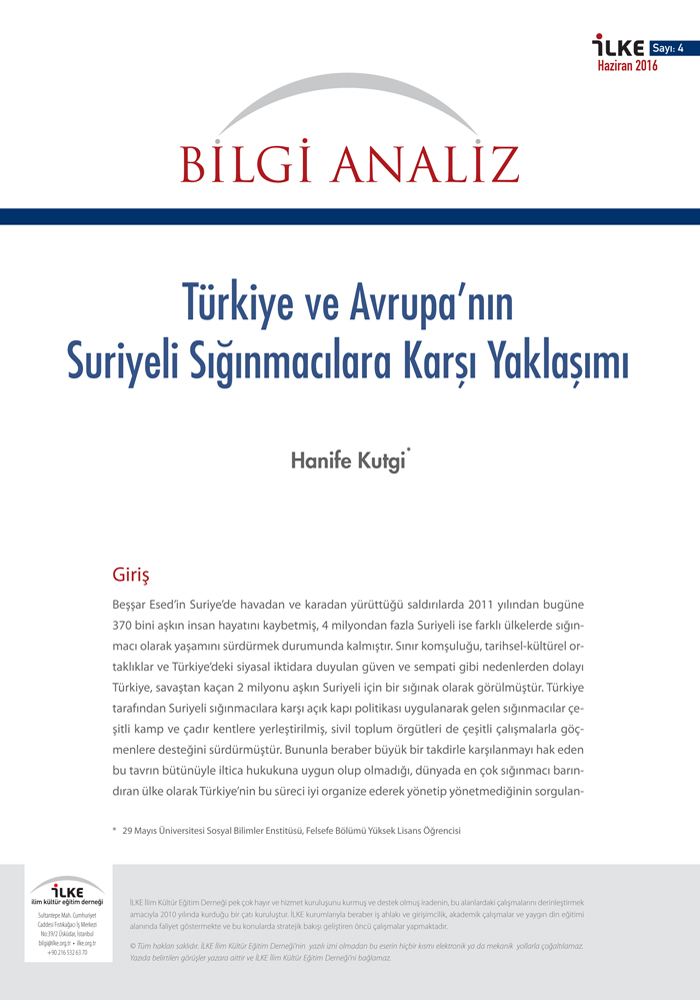 Hanife Kutgi’nin kaleme aldığı "Türkiye ve Avrupa’nın Suriyeli Sığınmacalara Karşı Yaklaşımı" başlıklı Bilgi Analiz Suriyeli sığınmacıların Türkiye ve Avrupa’daki durumunu...